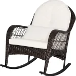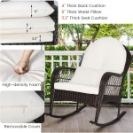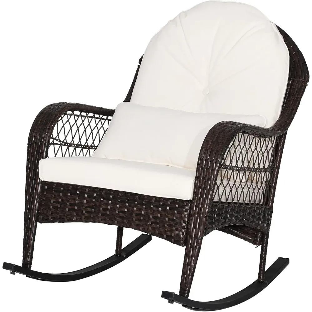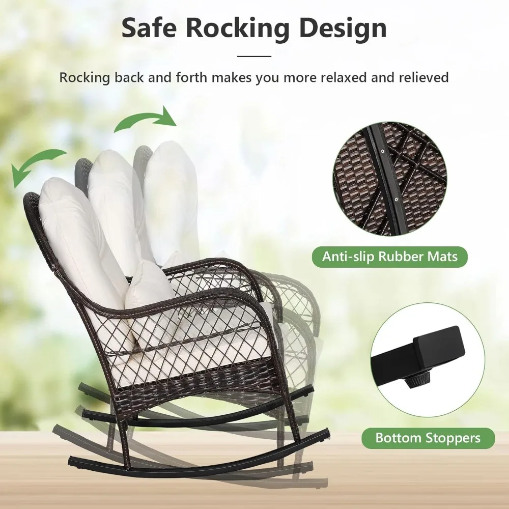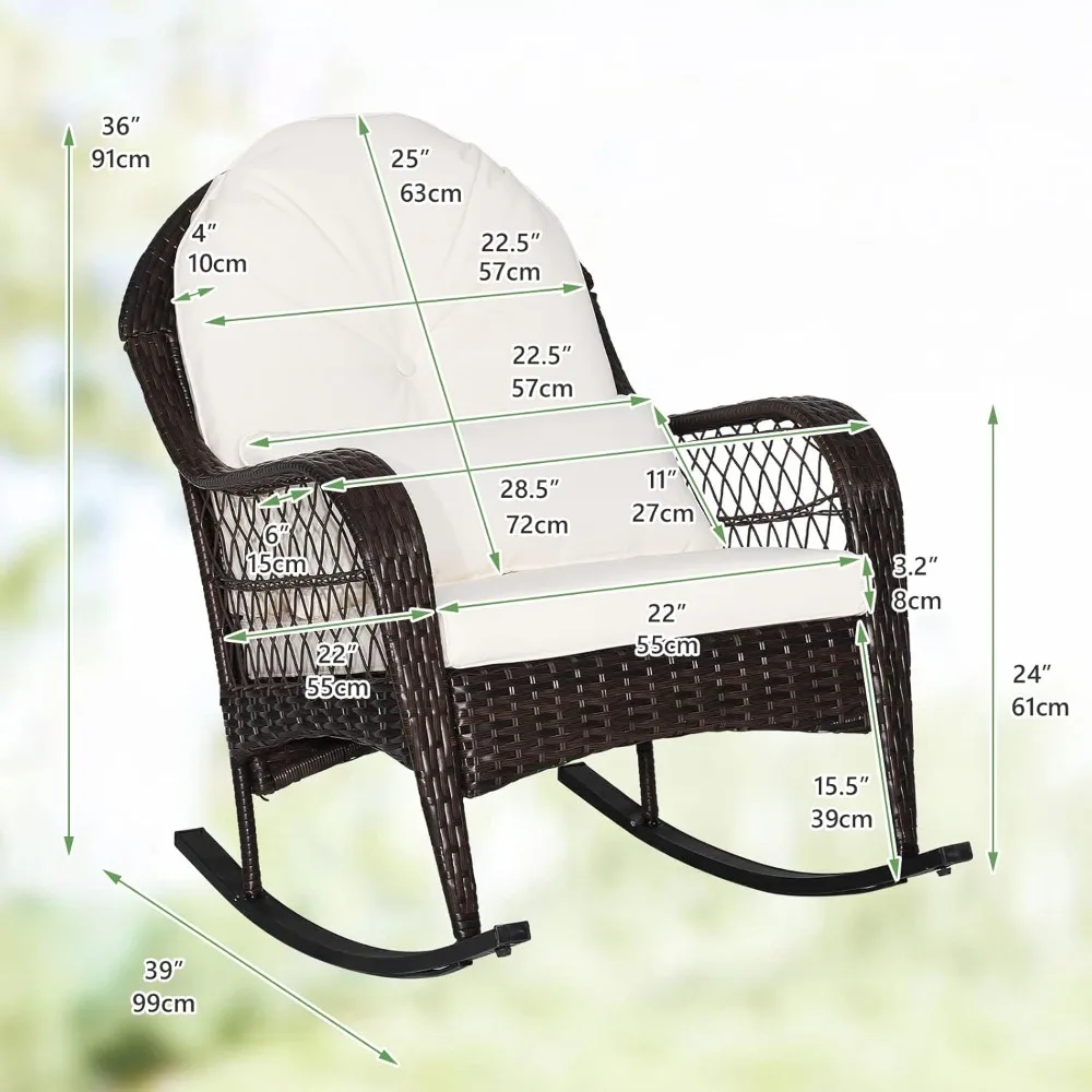 Here’s a rewritten product description based on the provided information: — Discover the comfort and style of our curved rocking chair, designed to provide a safe and soothing rocking experience. This rattan rocking chair is perfect for enjoying a peaceful nap in your backyard, with a non-slip bottom to ensure stability and a safe range of motion. Our patio furniture is crafted from a rust-resistant powder-coated steel frame and hand-woven PE rattan wicker, making it durable and able to withstand various weather conditions. The seat offers high stability and can support up to 400 lbs. Experience ultimate comfort with our chair’s curved armrests, extra-deep 4-inch thick back-support cushions, 3.2-inch thick seat cushions, and 6-inch thick waist pillows. All cushions come with removable zipper covers for easy cleaning and long-lasting durability. Add a charming touch to your outdoor space with this wicker rocking chair. Its compact and lightweight design makes it easy to move around, making it perfect for use on your patio, front porch, backyard, balcony, deck, poolside, or garden. Assembly is a breeze with our rocking chair set, which comes with instructions for easy setup. Remember to align all holes before tightening the screws. The chair dimensions are 28.5 inches wide by 39 inches deep by 36 inches high, and it has a weight capacity of 400lbs. —